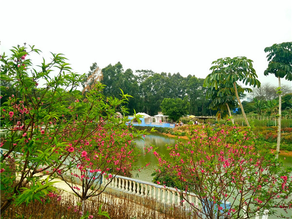 園內(nèi)還有一條彎彎的、翠綠的小河,沿著河岸,一棵棵粉紅的桃樹亭亭玉立。河面上波光粼粼,粉紅的桃花、碧綠的小草、白鴿的影子倒映在湖面上,有木有陶醉?